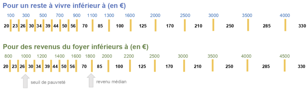 Chaque mois, les participant.es à la caisse verse une contribution volontaire, mais obligatoire, selon leur capacité financière. Pour assurer la pérennité financière de la caisse et être moins dépendant de subventions extérieures, une grille de contribution suggérée est proposée en fonction de l’ensemble des revenus du foyer ou de son reste à vivre :