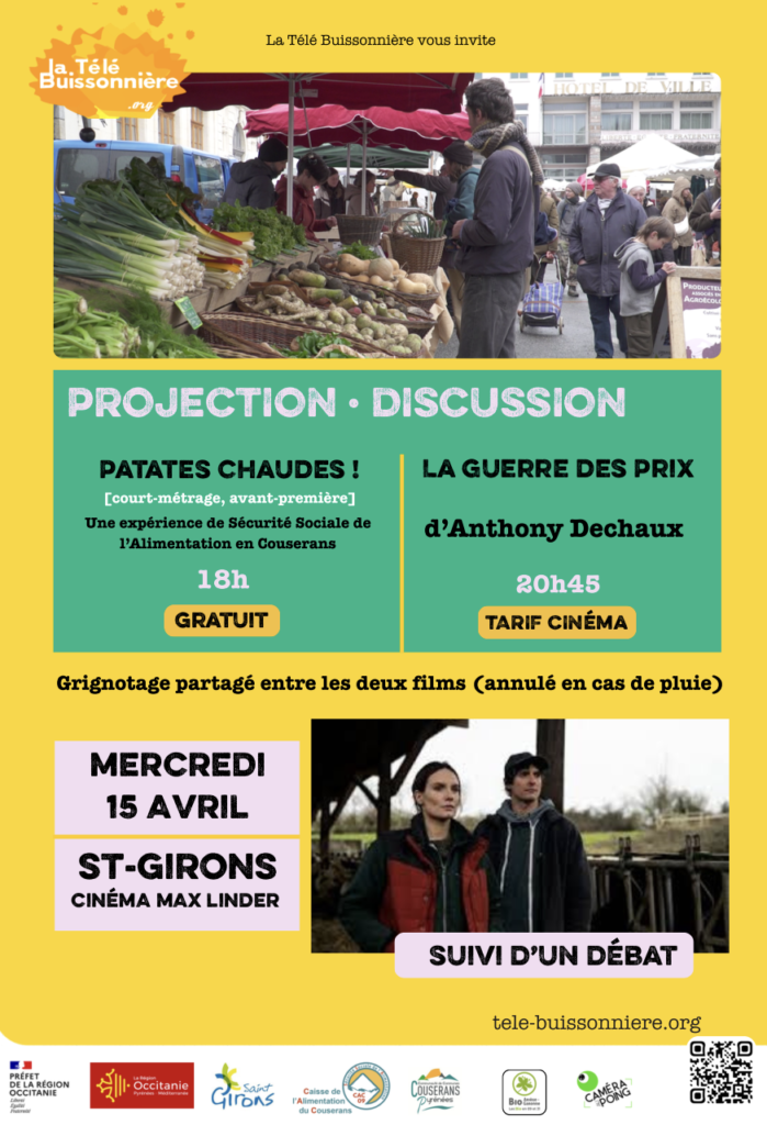 | La caisse de l’alimentation du Couserans vous attend nombreux la semaine prochaine pour la projection du documentaire « Patate chaude – Une expérimentation de Sécurité Sociale de l’Alimentation en Couserans », un film collectif avec la Télé Buissonnière. Plusieurs personnes de la caisse ont participé à sa réalisation : conception du scénario, tournage en extérieur et de scènes en stop-motion, témoignages et performance vocale d’une chorale improvisée. De quoi surprendre et en apprendre plus sur la Sécurité sociale de l’alimentation et l’initiative de caisse alimentaire locale. Deux rendez-vous : – 13 avril à 19h30 au Paradis païen (Castet d’Aleu) pour un ciné-soupe ; d’autres courts-métrages au programme – 15 avril à 18h au cinéma Max Linder (St-Girons) pour toute une soirée sur l’alimentation avec projection du docu (gratuit), discussion avec les réalisatrices et des membres de la caisse, grignotage et une fiction « La guerre des prix » d’Anthony Dechaux (tarif cinéma) |